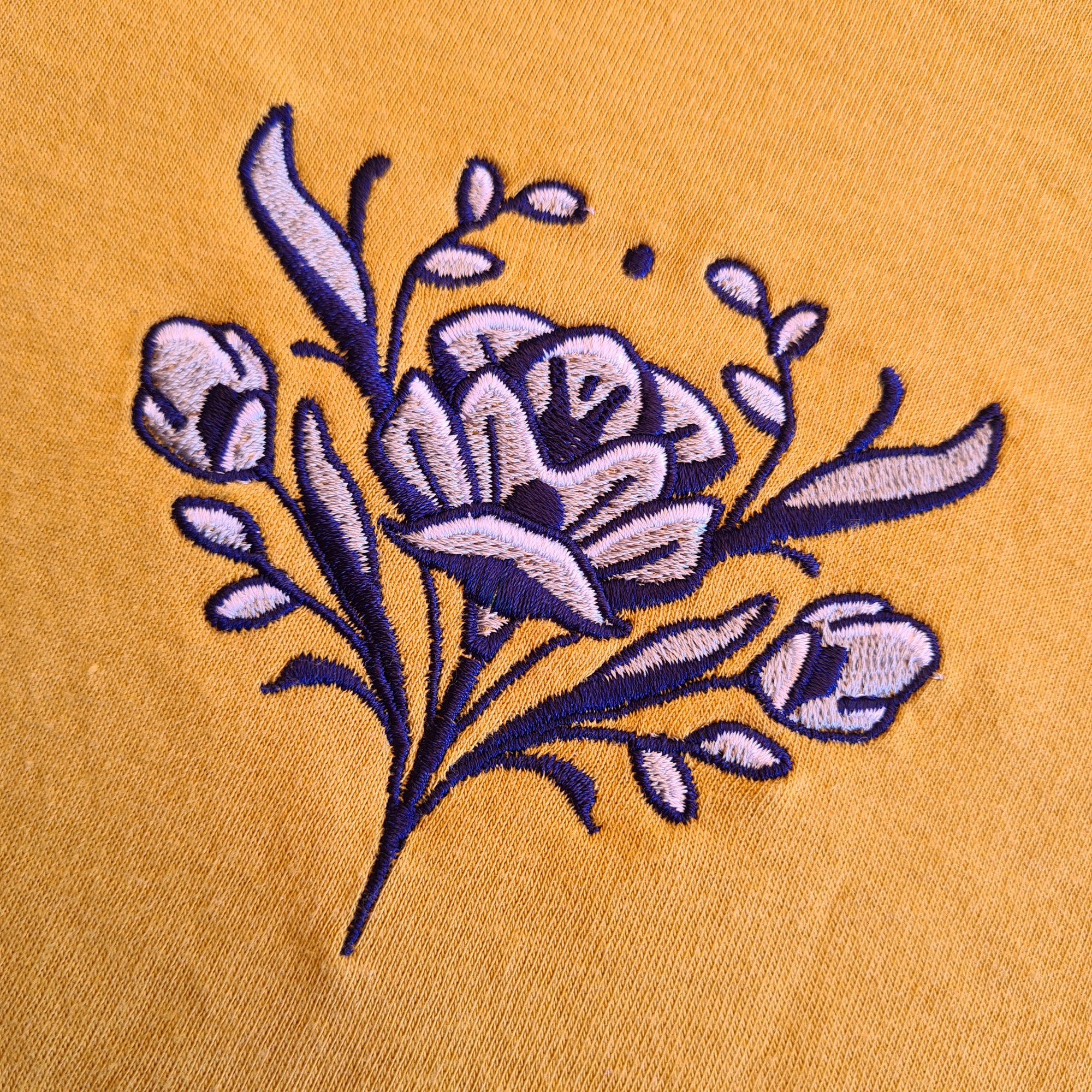 The floral design is carefully designed by Stickystef. And it is embroided on the shirt for an extra luxury feeling. This also keeps the design colorful after washing.